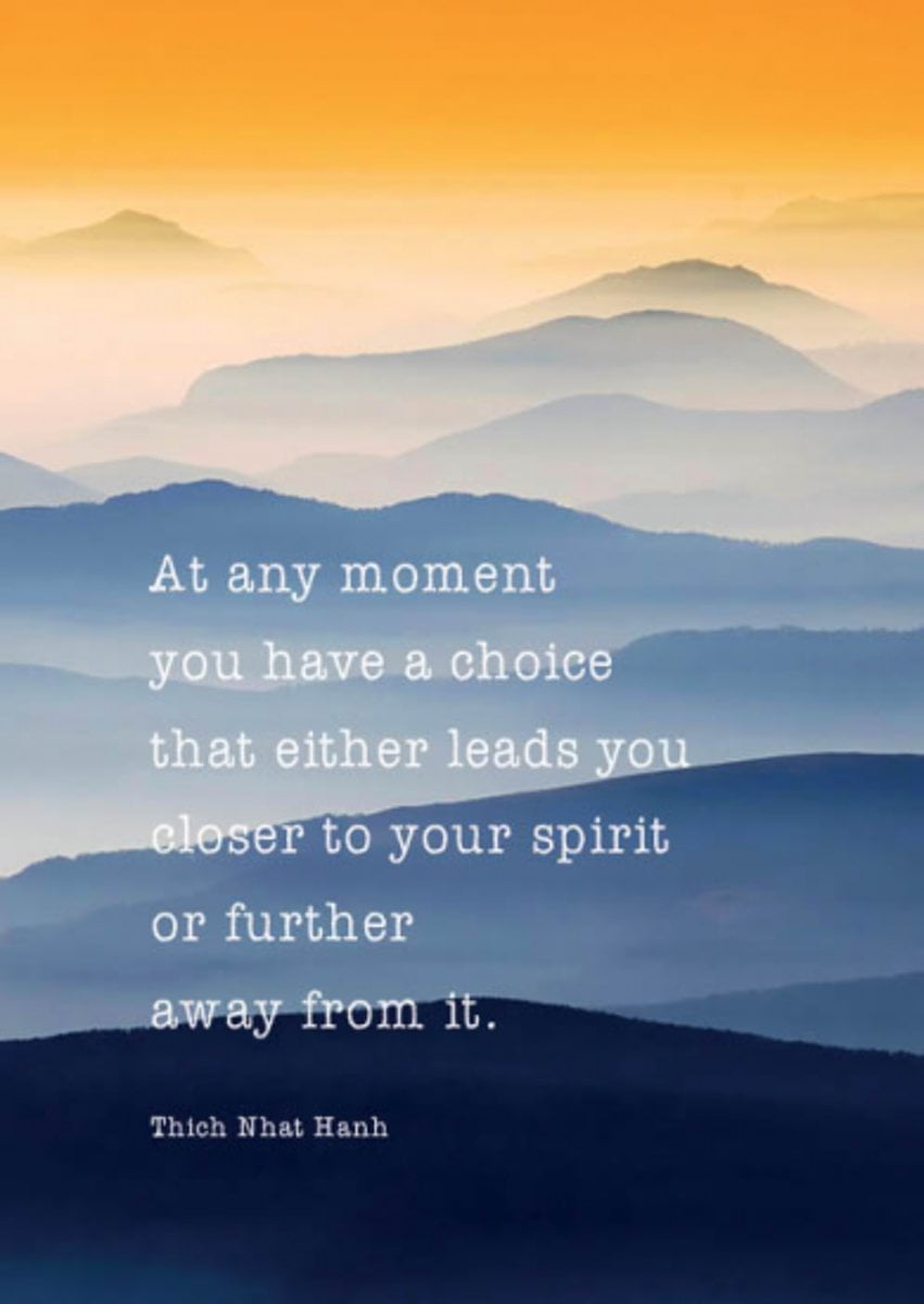 Deze Ansichtkaart At any moment.. is een mooie bemoedigende ansichtkaart met berglandschap om naar iemand te sturen. Met de tekst At any moment you have a choice that either leads you closer to your spirit or further away from it. (Nederlandse vertaling: “Op elk moment heb je een keus dat je dichter naar je geest brengt of verder er vanaf.”)