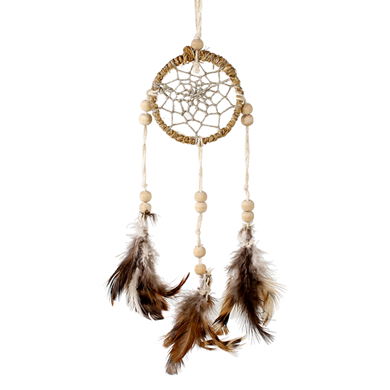 Leuke Dromenvanger Hennep naturel klein gemaakt van hennep, hout en veren. Dromenvangers vinden hun oorsprong bij de inheemse Amerikanen die geloven dat elke ruimte gevuld is met goede en slechte dromen. Wanneer een dromenvanger vrij slingerend boven het bed wordt opgevangen zal deze de dromen vangen. De goede dromen kunnen dan door de buitenste gaten van de dromenvanger langs de veren wegglijden. De slechte dromen weten de weg niet, deze raken verstrikt in de dromenvanger en verdwijnen met het eerste licht van de nieuwe dag.