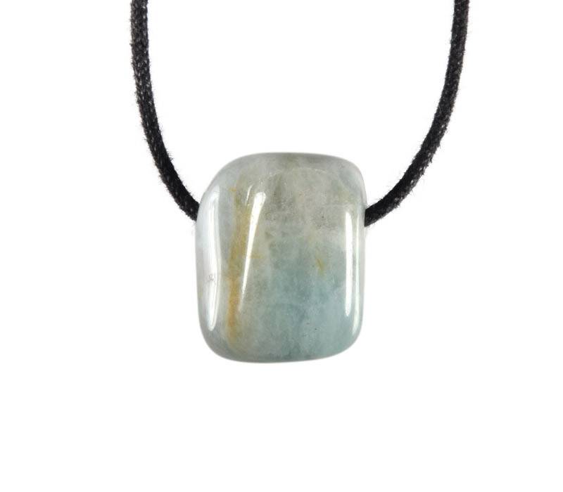 Mooie Hanger Aquamarijn trommelsteen voor om de hals. Deze trommelsteen is doorboord zodat het koord er doorheen past.