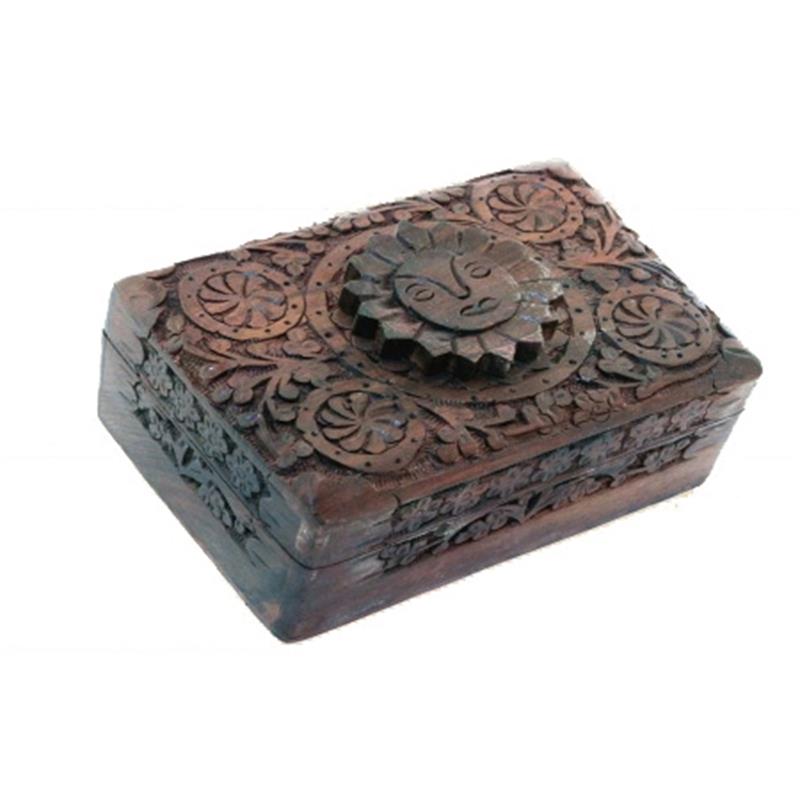 Dit houten kistje Zon wordt ook wel een tarotdoos genoemd en is mooi gedecoreerd met onder andere een zon logo. De decoratie is met de hand in het houten kistje gesneden en de binnenkant van het kistje is bedenkt met een rode stof. Rondom de zon en aan de zijkanten van het kistje is een bloemenmotief uitgesneden.