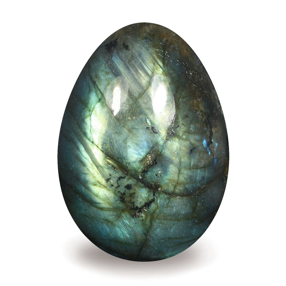 Vakkundig geslepen ei van labradoriet, mooi om ergens neer te leggen, maar ook geschikt om te gebruiken voor massage of als knuffelsteen.