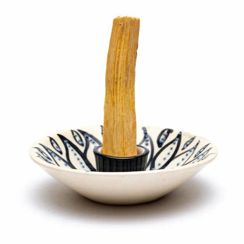Palo Santo houder, gemaakt van hoogwaardig keramiek, in de kleur wit. Deze wierookhouder is speciaal ontworpen voor het veilig branden van Palo Santo sticks, maar ook geschikt voor het branden van wierookkegeltjes. Palo Santo, wat ‘heilig hout’ betekent, wordt gebruikt als wierook en toegepast bij allerlei rituelen en ceremonies. Het brandende hout heeft een heerlijk aroma. Aan de rook en de geur van Palo Santo worden heilzame en zuiverende eigenschappen toegeschreven. Door het gebruik van de speciale Palo Santo houder kan optimaal worden genoten van het moment. Het prachtig gedecoreerde schaaltje, gemaakt van hoogwaardig keramiek, is bovendien een lust voor het oog. Ieder exemplaar is met de hand vervaardigd en beschilderd, om vervolgens te worden gebakken. Ze zijn daarom één voor één uniek.