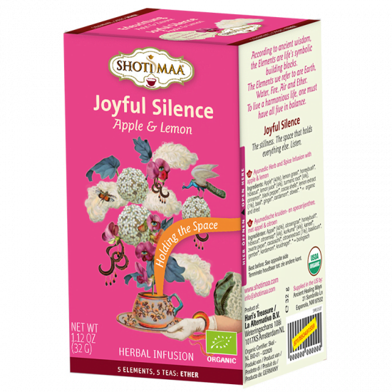 Shoti Maa BIO thee Joyful Silence appel & limoen is onderdeel van de thee reeks ‘vijf elementen’ genoemd die symbool staan als de bouwstenen van het leven. Deze thee staat symbool voor Ruimte, de andere varianten zijn: Aarde (Touch the Ground), Water (Emotional Detox), Vuur (Purity Flame) en Lucht (Life on Wings). Volgens oude wijsheden dienen deze vijf bouwstenen van het leven in balans te zijn met elkaar. De andere bouwstenen zijn uiteraard ook te bestellen in onze webshop.