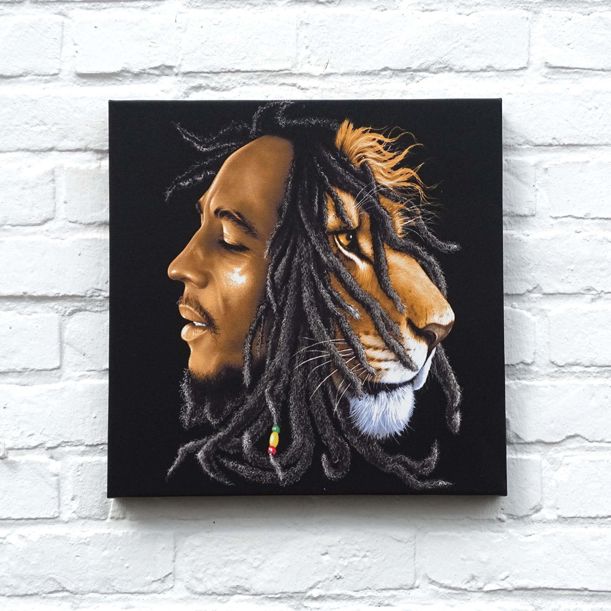 Klein canvas met afbeelding van Bob Marley en een leeuw met dreadlocks. Binnen de Rasta movement staan de dreadlocks onder andere symbool voor de manen van de leeuw. De leeuw refereert op zijn beurt naar de ‘Lion of Judah’, wat een van de titels is van de Ethiopische keizer Haile Selassie I. Deze legendarische heerser wordt door (veel) Rasta’s gezien als de manifestatie van God op Aarde. Haile Selassie I werd geboren als Tafari Makonnen en kreeg later de titels ‘Ras’, wat koning betekent. Zo ontstond de benaming Ras Tafari. Rasta’s zijn dus letterlijk gezien de volgelingen van Hem. De afmetingen van het op hout gespannen doek zijn 30 bij 30 cm, waardoor het past in vrijwel iedere (woon)kamer.
