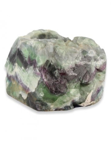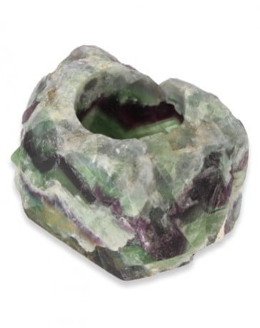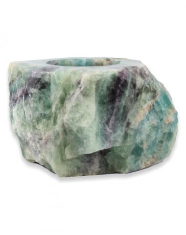 Dit prachtige sfeerlicht gemaakt van fluoriet is half gepolijst, zodat ook de natuurlijke uitstraling van het gesteente deels behouden blijft. De gepolijste zijde van de steen toont de schitterende kleuren en helderen kristallen, die tijdens het branden van een kaarsje adembenemend mooi oplichten. De theelichthouder is geschikt voor een waxinelichtje of een LED-lichtje.