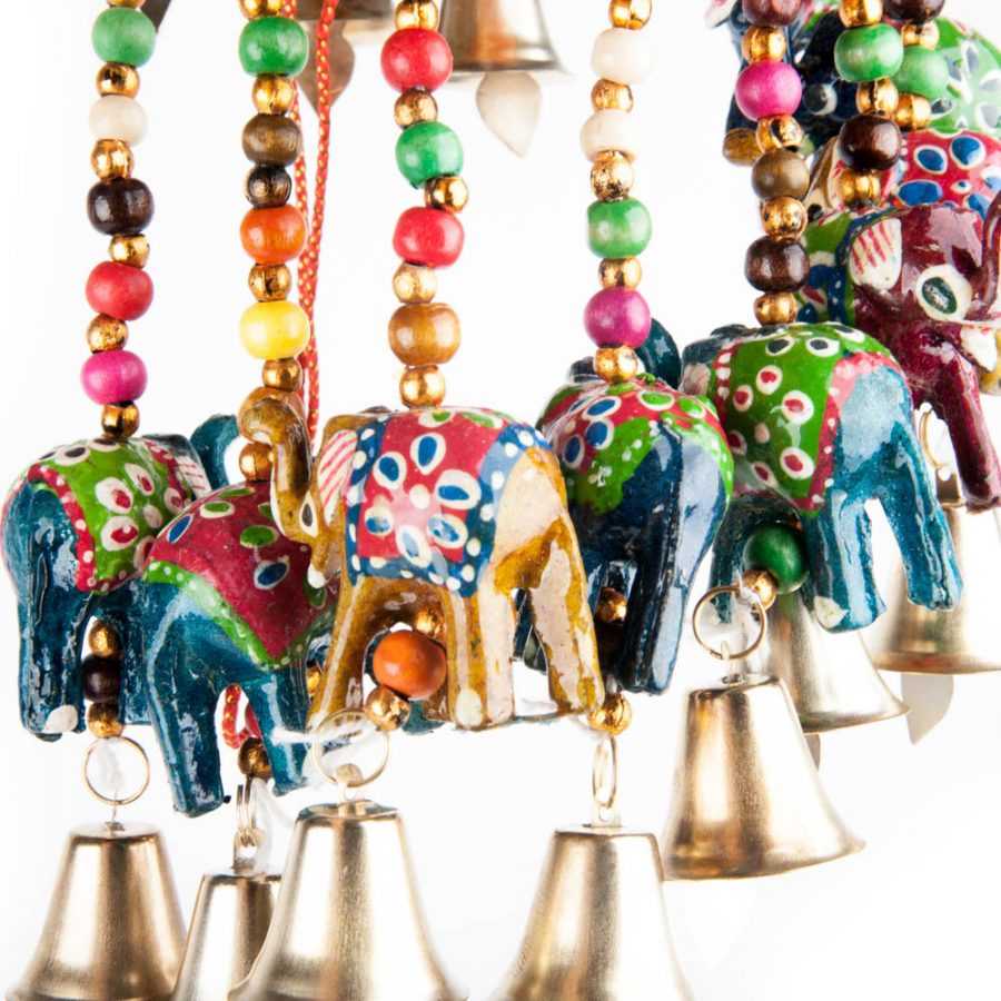 Mobiel 15 gekleurde olifantjes is een speels en uniek decoratiestuk. Aan de uiteinden van iedere slinger hangt een belletje waardoor bij aanraken of wind geluid vrijkomt. Boven de kap is een koord bevestigt waardoor dit mobiel 15 gekleurde olifantjes makkelijk opgehangen kan worden in de ruimte. De olifantjes zijn met de hand beschilderd en daarom is ieder olifantje uniek.